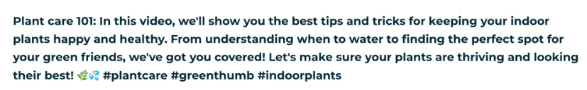 The search-optimized caption example result: "Plant care 101: In this video, we'll show you the best tips and tricks for keeping your indoor plants happy and healthy. From understanding when to water to finding the perfect spot for your green friends, we've got you covered! Let's make sure your plants are thriving and looking their best! #plantcare #greenthumb #indoorplants"
